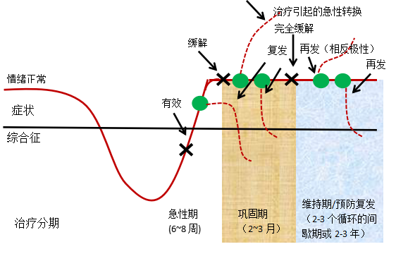 由于雙相障礙幾乎終生以循環方式反復發作,其治療目標除緩解急性期癥狀外,還應堅持全病程治療原則以阻斷反復發作。醫生應在治療開始前告知患者和家屬全病程治療的重要性及實施辦法,爭取良好的依從性。全病程治療可分為3個治療期: